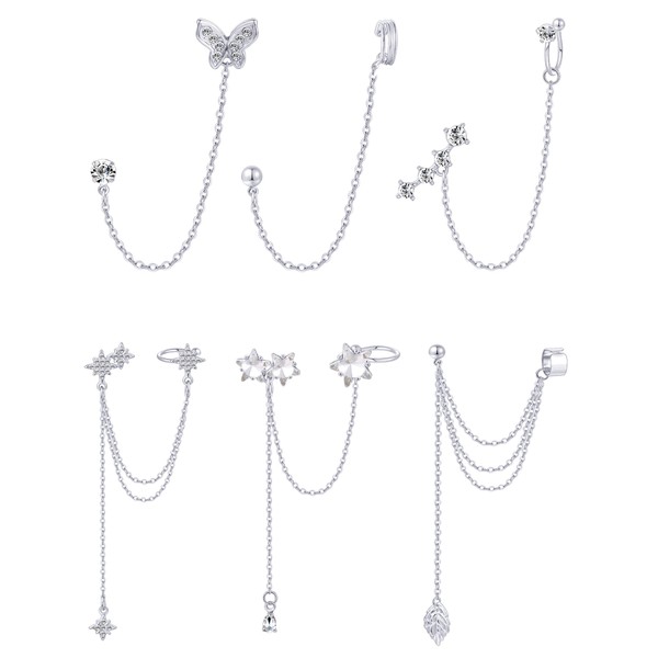 Tornito 6Pcs Cuff Earring Chain Leaf Snowflake Star Butterfly with CZ Crawler Climber Earring Studs Drop Dangling Chain Wrap Tassel Earring for Women Men 20G Silver Tone