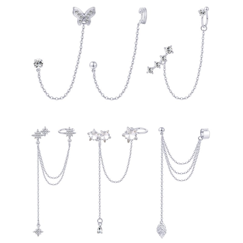 - 6PCS ONE SET: One Order include 6Pcs Cuff Earring Chain: Butterfly/CZ Crawler/Star/Leaf/Snowflake Ear Clip, Lightweight and Unique, Silver and Gold for you to Choose, Make you Stand out in the Crowd