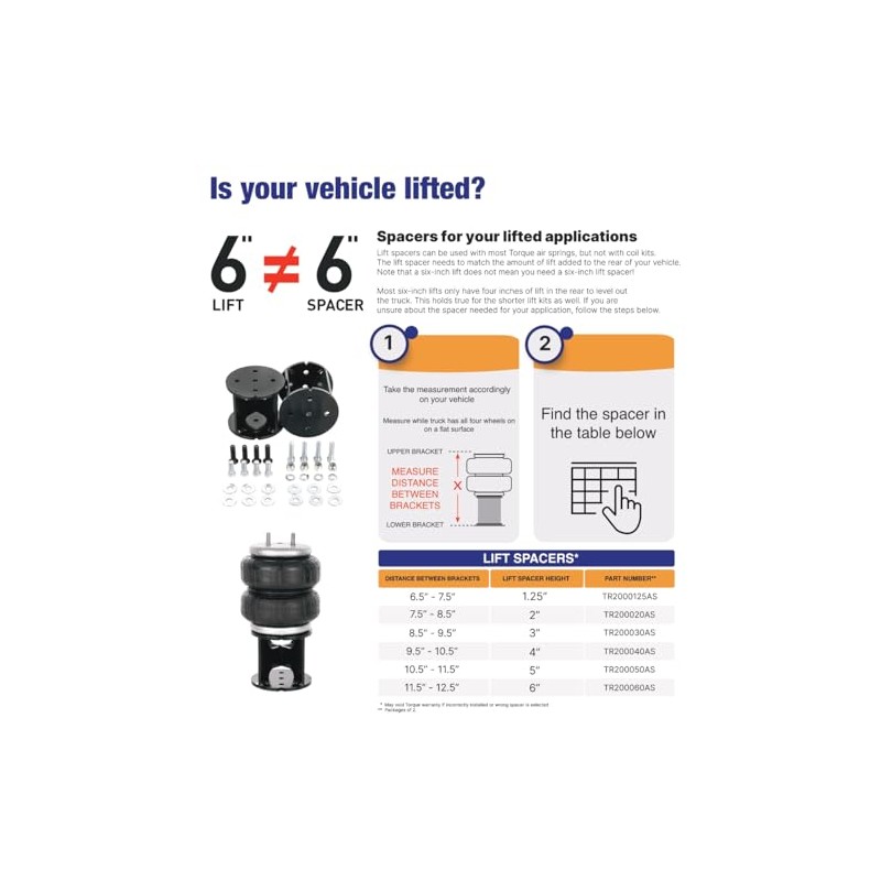 - How to decide the height - Do not assume that a 6" lift kit will require a 6" lift spacer. Most 6" lifts only have 4" of lift in the rear to level out the truck. Please, see the pictures about how to decide how many inch spacer you need.