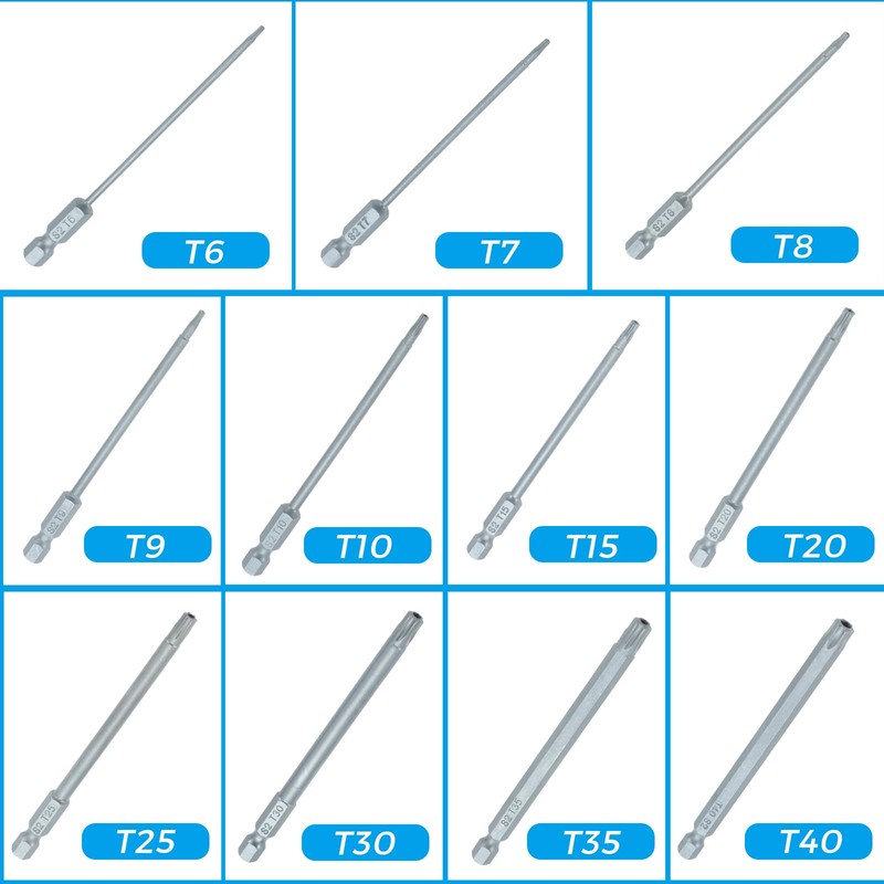 - Set Contents: T6, T7, T8, T9, T10, T15, T20, T25, T27, T30, T40. Shank Diameter: 6.35mm / 1/4" Hex Shank Total length: 100mm