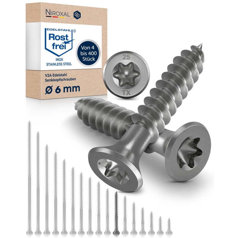 - Countersunk wood screw with partial thread, perfectly suited for outdoor use. The NIRO material V2A ensures a high resistance to external weather influences. No more hassle with rusty screws and rust stains on the wood. Especially suitable for rural areas, industrial areas and motorways. Acid rain is no problem for the material V2A.