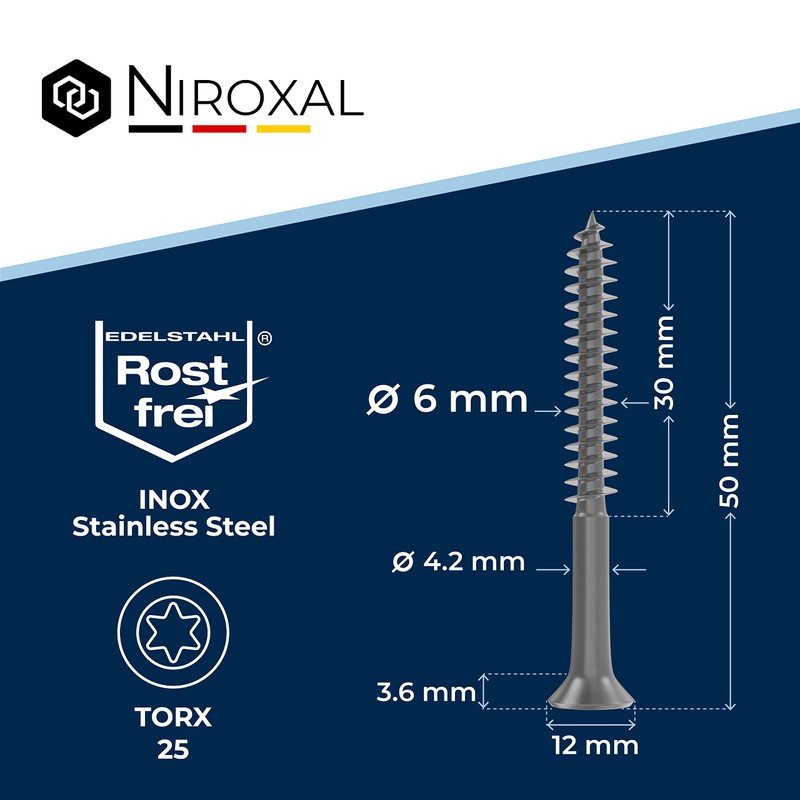 - Pre-drilling is usually not necessary (depending on the wood). Effortless cutting thanks to the smooth TORX drive with reinforced head and high-quality anti-friction coating on the INOX universal screws. Practical tips for correct drilling can be found in the product description (English language not guaranteed).