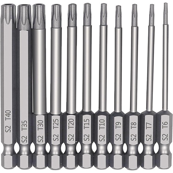 - [Size] Torx 3.0 inch (75 mm) driver bits: T6, T7, T8, T9, T10, T15, T20, T25, T27, T30, T40. Shaft Diameter: 0.25 inch (6.35 mm) Hex Shaft