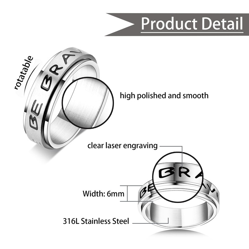 - 【Design of the Spinner Rings Series】This fidget spinner rings series contains 8 styles of rings that have different inspiring words: be brave, always by my side, faith hope love, I am enough, I am me, keep fucking going, never fucking give up, you fucking got this. The 8 styles rings could fit whether women or men, and also meet different needs. Elegant design with premium quality stainless steel made the rings eye-catching and fashionable