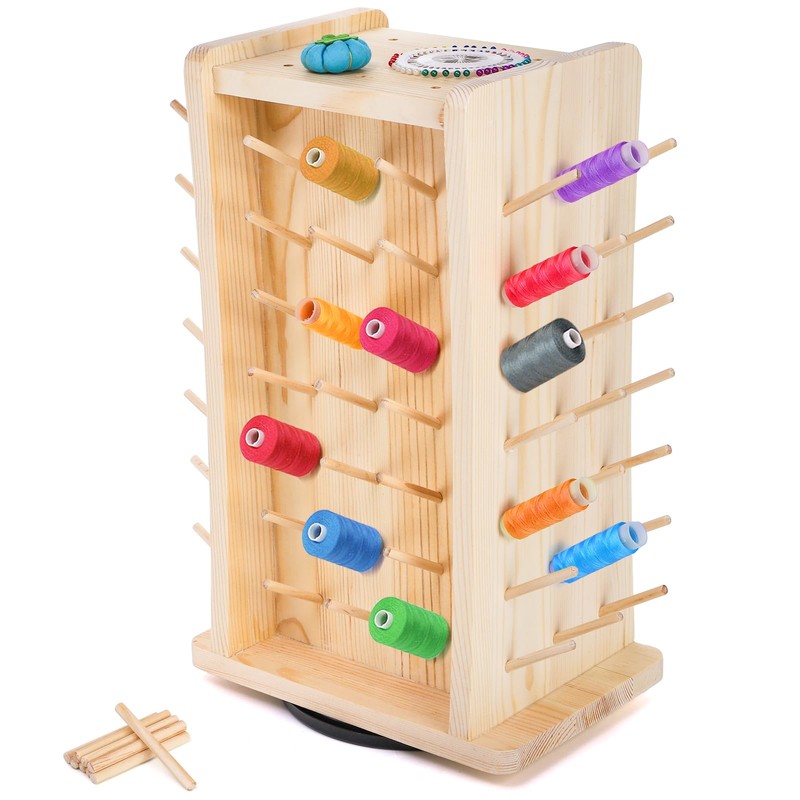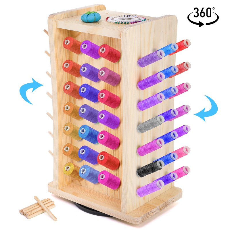 - Easy to Use: Tosnail wood thread holder can rotate a full 360° smoothly without jamming. The top designed with 9 holes without spindles, the 9 spare spindles are included in the package. You can use a hammer to knock them into the reserved holes as needed, or leave it as it is and place any other items on the top.