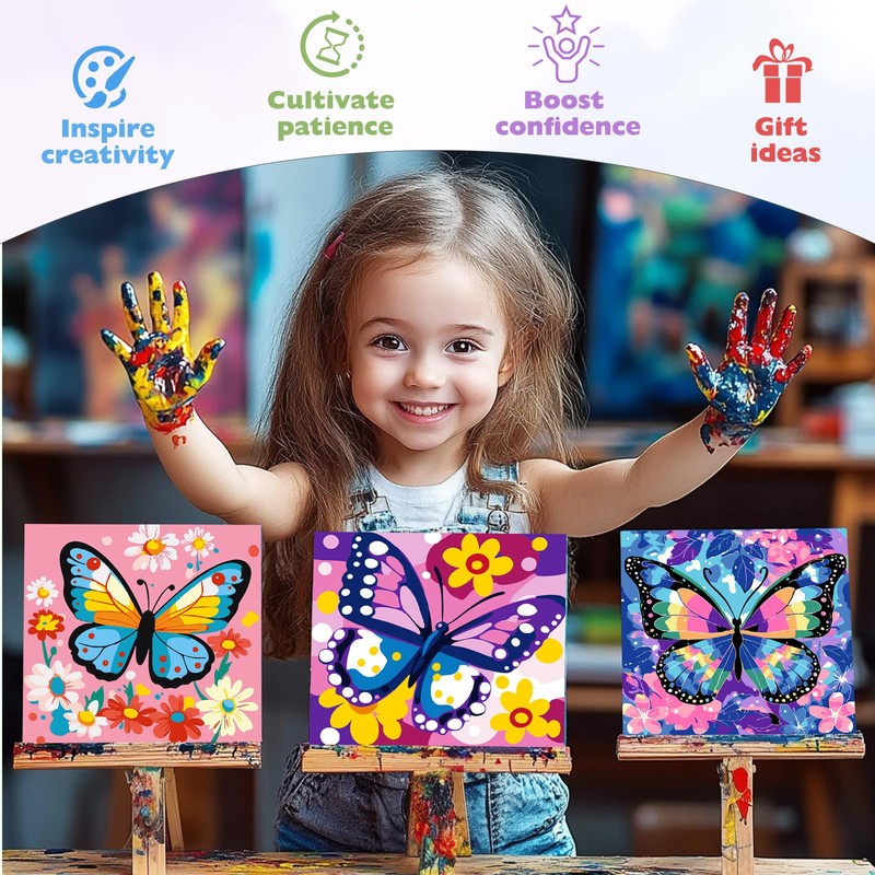 TOSTOG 4 Pack Paint by Number for Kids with Wooden Frame, DIY Butterfly Paint by Numbers for Kids Ages 8-12, Acrylic Oil Painting Kits Easy Paint by Number for Gift Home Wall Decor 8in X 8in