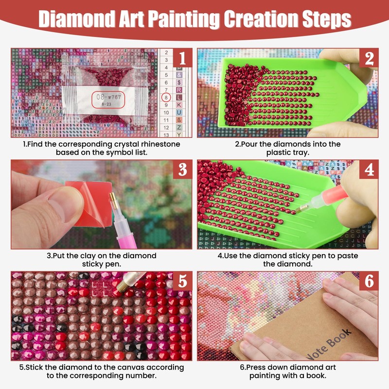 - All tools included: Diamond painting set contains all tools, 1 high-resolution canvas, 1 diamond tray, 1 solid glue, 1 corrector, 2 diamond pens, 5 ziplock bags and enough round diamonds, so you don't have to buy additional tools.