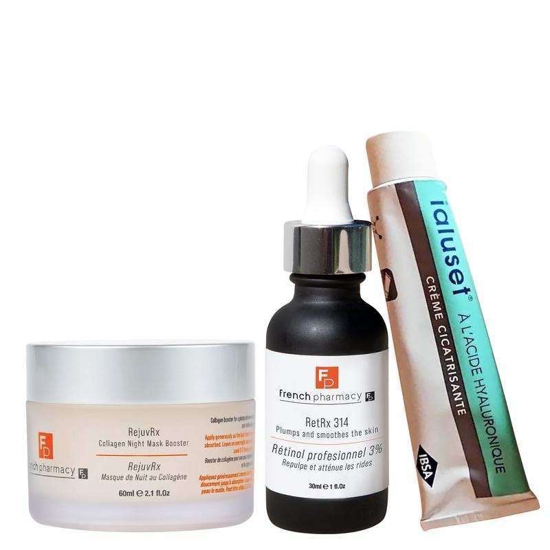 Complete Nighttime Skincare Set – Total Reset Night Routine includes Ialuset Hyaluronic Acid Cream, RejuvRx Collagen Mask, and RET314 Retinol Cream for a full-spectrum overnight skincare solution.