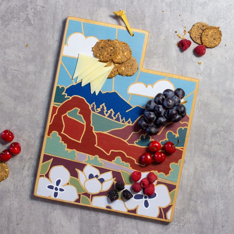 Totally Bamboo Utah State Shaped Cutting Board and Charcuterie Serving Platter with Artwork by Summer Stokes, Includes Hang Tie for Wall Display Varies