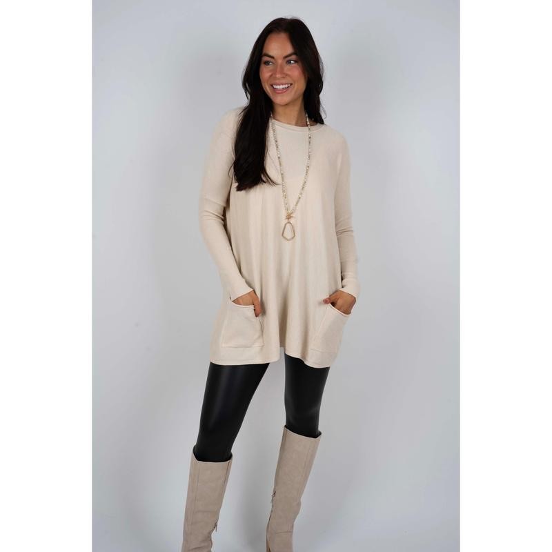 You'll be completely smitten with this gorgeous sweater. This sweater has an oversized fit with front pockets and a crew neck! final sale item 52% Viscose 28% Polyester 20% Nylon Unlined Material has a generous amount of stretch Model is wearing a S/M