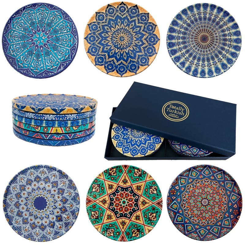 Totally Turkish – Patterned Drink Coasters Set of 6 – Giftable Design Drinks Mat Set – Non-Scratch Top & Non-Slip Cork Base (Mediterranean)