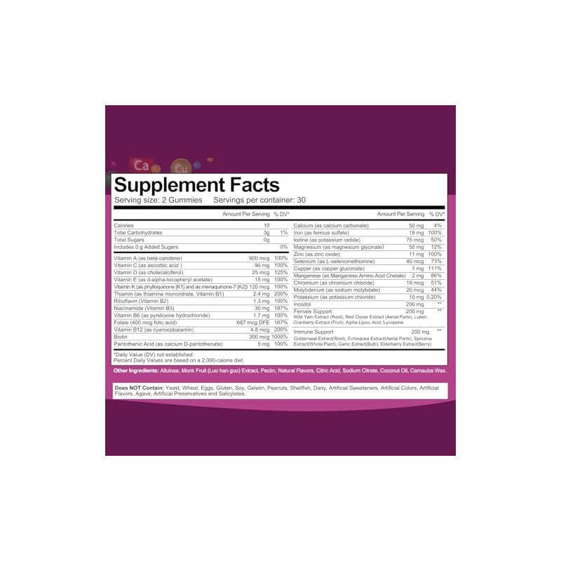 - Essential Minerals for Overall Health: Key minerals such as Calcium, Iron, Magnesium, Zinc, Chromium, Molybdenum, and Potassium are included. These minerals contribute to bone health and immune support. Suitable for Women, ages 14+. Whether you are a 40+, 50+ women, you can feel confident with your health from Totaria multivitamin gummies.