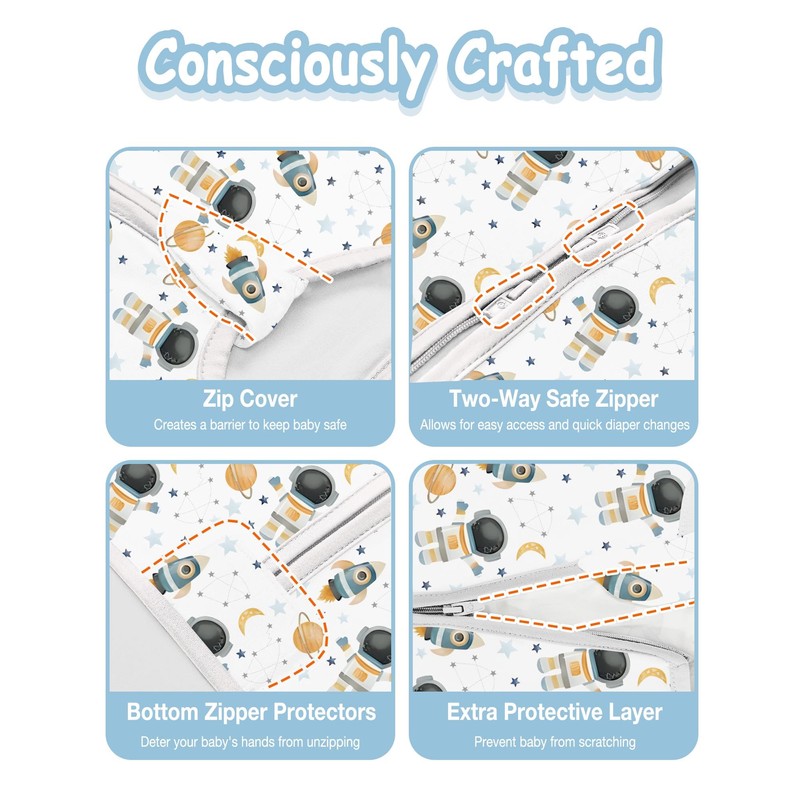 - Safe 2-way Zipper: Our sleep sack’s 2-way zipper simplifies midnight diaper changes. A zipper cover and chin guard protect your baby’s delicate skin from irritation, while the interior zipper guard prevents accidental scratches for added comfort. Bottom zipper protectors ensure curious little hands stay safe and keep the zipper securely in place, giving parents peace of mind