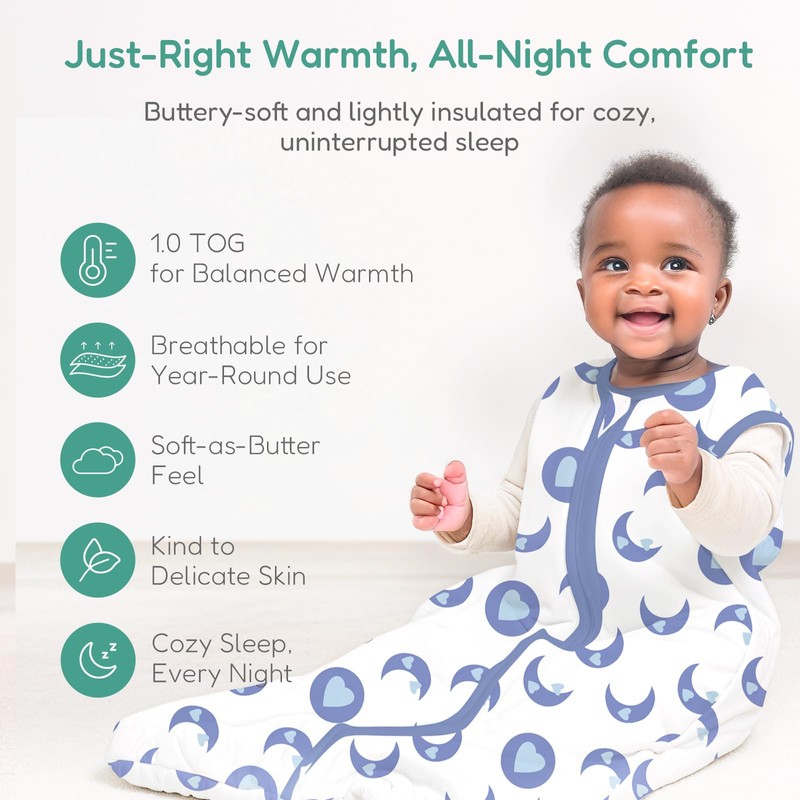 • ๐’๐จ๐Ÿ๐ญ๐ฅ๐ฒ ๐๐ฎ๐ข๐ฅ๐ญ๐ž๐ ๐Ÿ๐จ๐ซ ๐‚๐จ๐ณ๐ฒ, ๐๐ž๐š๐œ๐ž๐Ÿ๐ฎ๐ฅ ๐๐ข๐ ๐ก๐ญ๐ฌ : Crafted with our signature buttery-soft fabric and a double-quilted core, this 1.0 TOG sleep sack offers gentle insulationโ€”keeping your little one warm on cooler nights without overheating or bulk