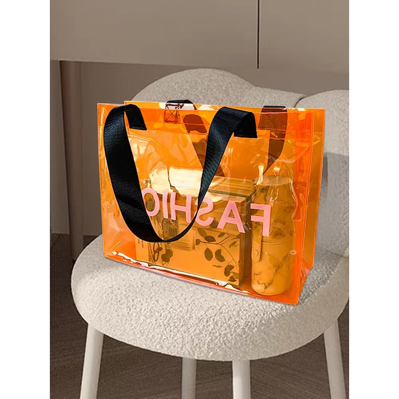 TotePrint Holographic Handbag Transparent Bag with Alphabet Pattern Lightweight & Waterproof for Beach Travel Shopping (Pack of 1), Orange+Fashion, M