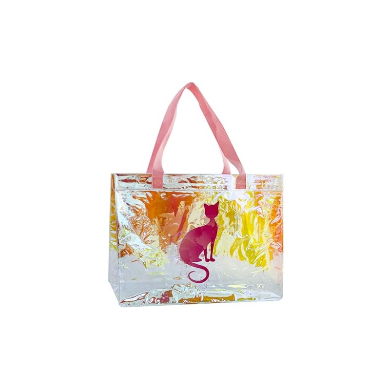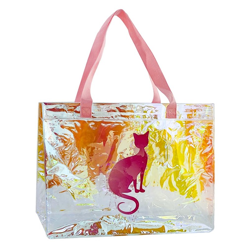 TotePrint Laser Cat Printing PVC Shopping Bag With Woven Handle Holographic Plastic Tote Beach Bag for Work Stadium Travel (Cat+Pink Woven Belt)