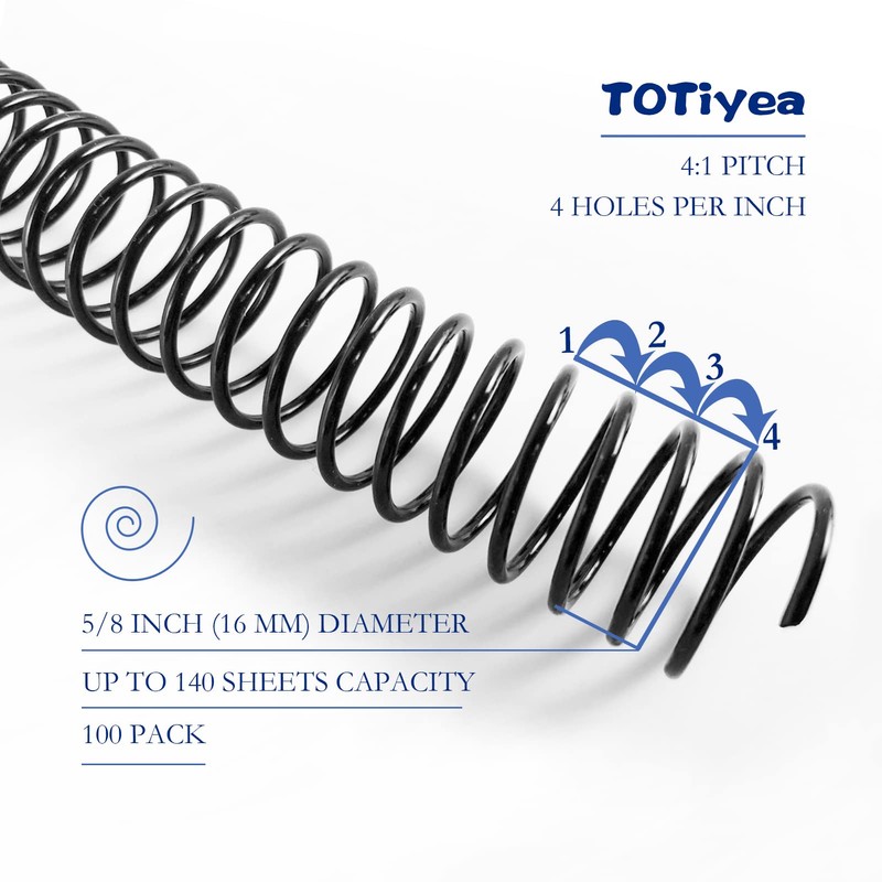 TOTiyea 100 Pack Plastic Spiral Binding Coils,16mm(5/8") Binding Spirals,140 Sheet Capacity,4:1 Pitch, Black
