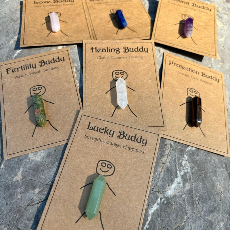 - Meaningful Symbols: Each crystal represents a specific aspect of personal growth and support: - Rose Quartz (Love Buddy): Love, compassion, support - Serpentine (Lucky Buddy): Strength, courage, happiness - Amethyst (Calming Buddy): Protection, soothing, healing - Clear Quartz (Healing Buddy): Clarity, calmness, healing - Tiger's Eye (Protection Buddy): Courage, luck, purpose - Fluorite (Fertility Buddy): Passion, health, bonding - Aventurine (Wisdom Buddy): Communication, harmony, confidence