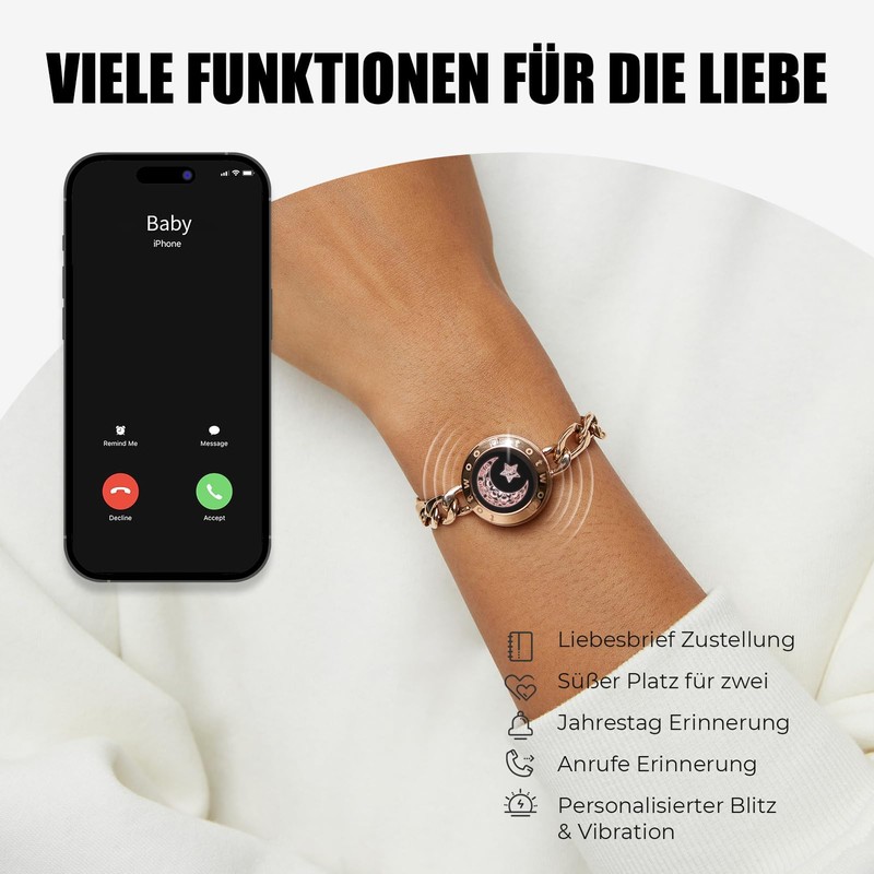 - All functions for love – Secret messages: Through the Totwoo app, you can send secret messages and love letters to surprise your loved one. Anniversary reminder: Your bracelet automatically reminds you of important dates. Never miss a birthday or anniversary again. Call notification: Add 6 important contacts in the app, and the bracelet vibrates and lights up to notify you of incoming calls.