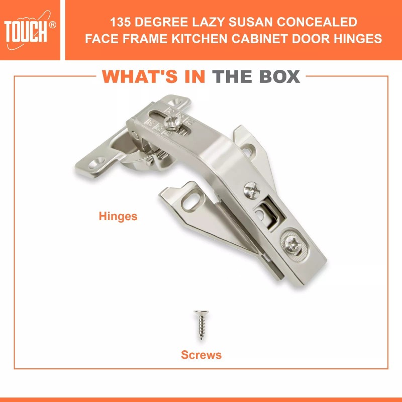 - Unlike other hinges, TOUCH lazy susan 135 degree clip on cabinet hinges come with heavy duty screws. The hinge’s unique clip on design allows you to easily connect and disconnect the hinge without any damage to the cabinet or the door. TOUCH’s unique design allows you to easily install and adjust the hinges to suit your cabinet. Your satisfaction is our main priority, and we trust that TOUCH hinges are the perfect choice for your cabinets!