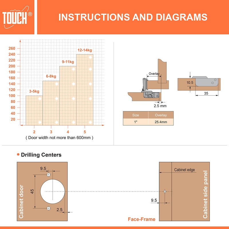 - Specifications: Opening angle: 105° Overly: 1″ Overlay Diameter of hinge cup: 35mm Height of hinge cup: 10.5mm Distance of cup screws holes centers: 45mm Door thickness range: 14-21mm.