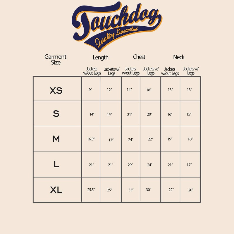The Touch dog lightening-shield waterproof 2-in-1 convertible dog jacket is inner-lined with exclusively developed Black shark technology, this innovative fabric is lightweight, waterproof, windproof, snow proof, breathable, cold- repellent, impermeable and tear resistant. The Outer shell is furthermore completely PU coated with 3 additional layers of wear and tear resistant coating. Water completely wicks off similar to a lotus leaf effect. This dog coat features a polar fleece interior that comfortably hugs the dogs body for added warmth and comfort. The inner fleece layer is furthermore completely removable and can be separated from the Outer shell to be used as a lighter weight fleece jacket. Features dual-tough Velcro enclosures with a leash slit hole by the neck area. Furthermore this dog jacket features 3m reflective lining for added safety during night walks. Features accented embroidery and a print on the Outer shell. Touch dog, the premium pet brand of tomorrow. Available in multiple colors and sizes. Sizing guide: from back of neck to tail area ("in" inches) 8" : extra small 10-12": small 14-16": medium 18-20": large 22-24": extra large.