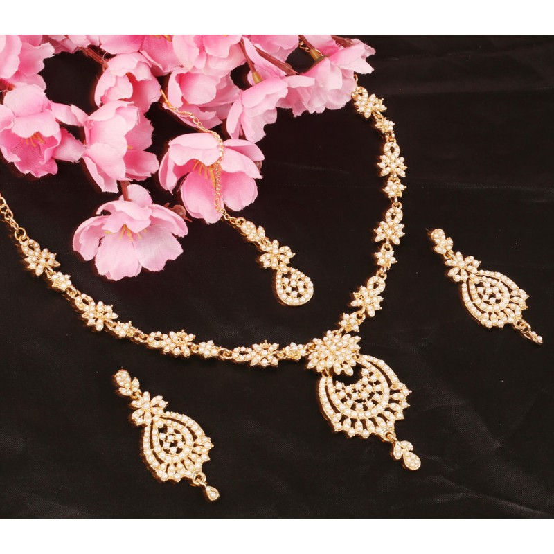 - NEW! Touchstone Indian Bollywood Trends Filigree Floral Pattern Sparkling Pearl Designer Jewelry Necklace Set Mangtika In Antique Gold Tone For Women. EXTRA LONG EARRINGS. Length 2.75 inches SPECIFICATIONS : V-shape necklace. Necklace circumference 15.50 inches. Extendable with chin/links up to 19.25 inches. Earrings weight (single) 11 gms. Earrings length 2.75 inches. Earrings width 1 inch. This is in a special dark gold plating to recreate the look of antique jewelry.
