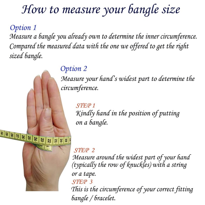 - PLEASE CHECK SIZE / DIAMETER OF OLD BANGLE (AND COMPARE) BEFORE ORDERING TO AVOID DISAPPOINTMENT. We offer many sizes from the smallest to the largest.