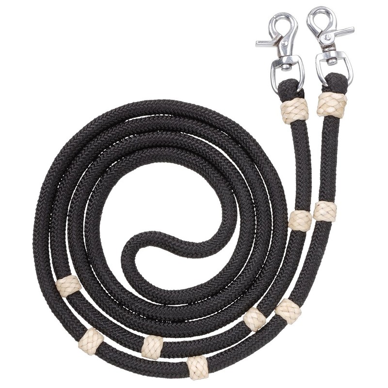 - Deluxe poly/cord roping reins with nylon knots and scissor snap bit ends