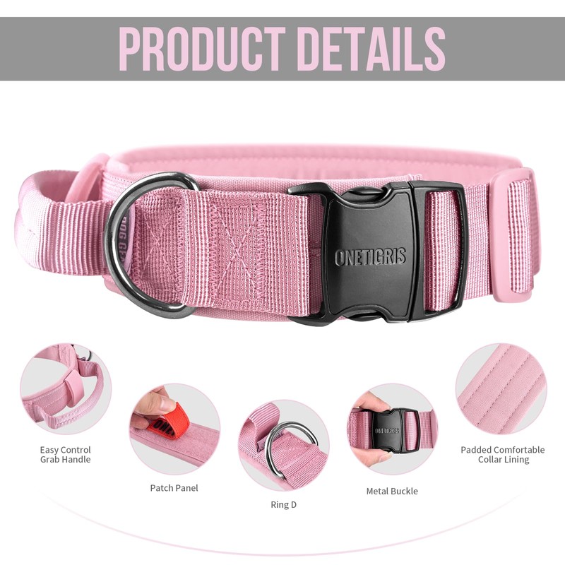 Tough Dog Collars, Tactical Dog Collar with Handle, Milltary Adjustable Dog Collar with Heavy Duty Metal Buckle for Training (Large,Pink)