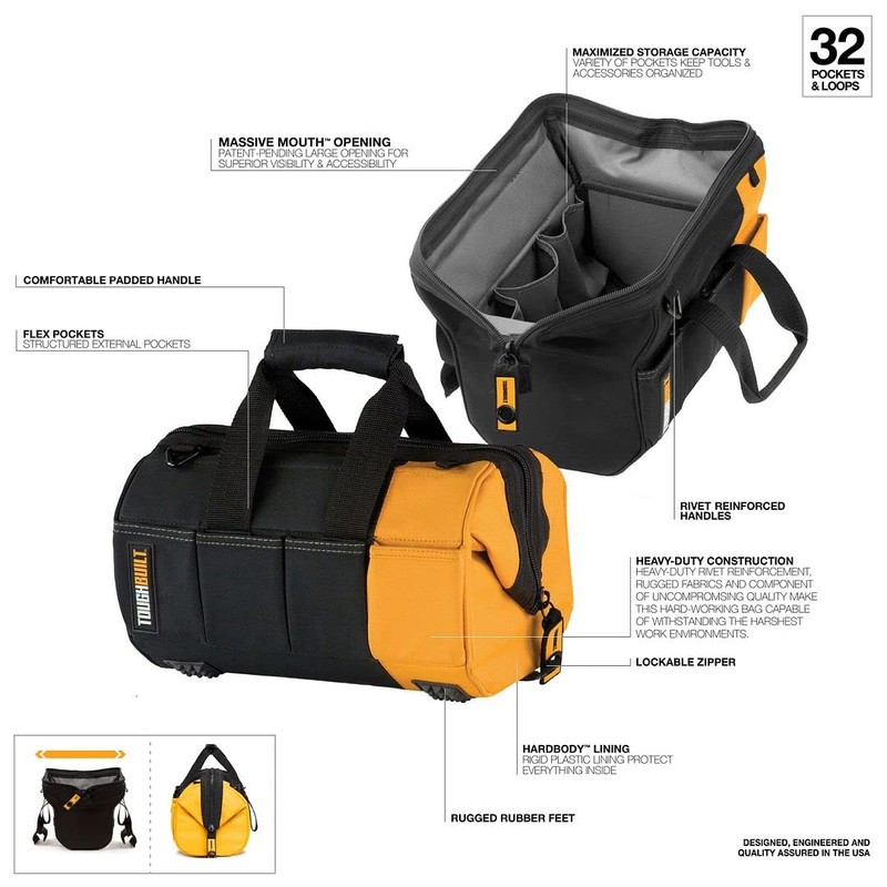 ToughBuilt Massive Mouth 30cm Wide Opening Tool Bag - 32 Compartments and Loops - Wide Opening Tool Storage Box - (TB-60-12-DE)
