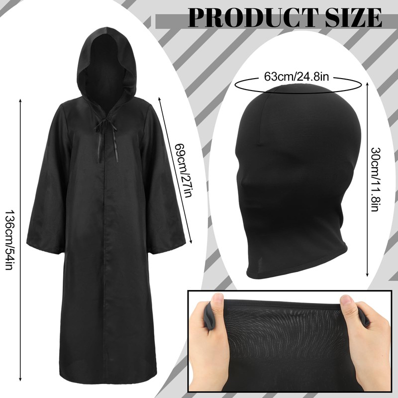 - Quality Polyester Material: both the black cloak and the full face mask are made from quality polyester; This ensures durability and comfort, allowing you to wear the costume for hours without any discomfort or worry about it tearing or fraying
