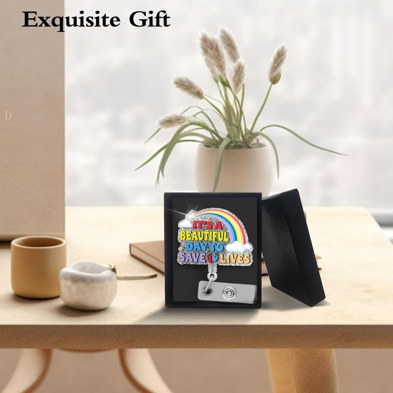 TOUNER It's A Beautiful Day to Save Lives Funny Rainbow Badge Reel with Silver Glitter, Retractable ID Clip Holder for ER RN ICU Nurse Doctor Medical Student, Thank You Gift for Therapist Coworkers