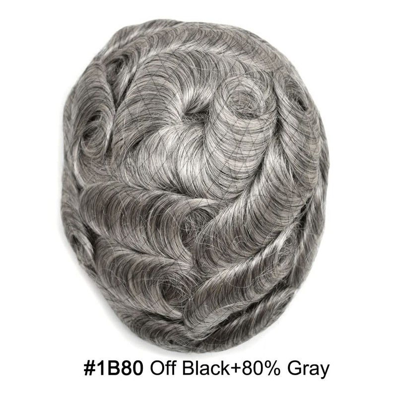 Toupee For Men Hair Piece Real Human Hair 0.06mm Ultra Thin Skin Mens Toupee Hair Replacement System For Men Hair System V-loop Hairpieces For Men7X9-80% density#1B80#1B OFF BLACK+80% GREY