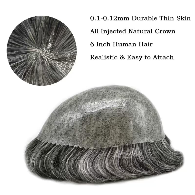 Toupee For Men Real Human Hair Replacement System 0.1mm All Injection PU Mens Toupee Durable Thin Skin Hairpiece For Men Prosthesis Hair Units Patch Wig #250 Darkest Brown Mixed 50% Gray