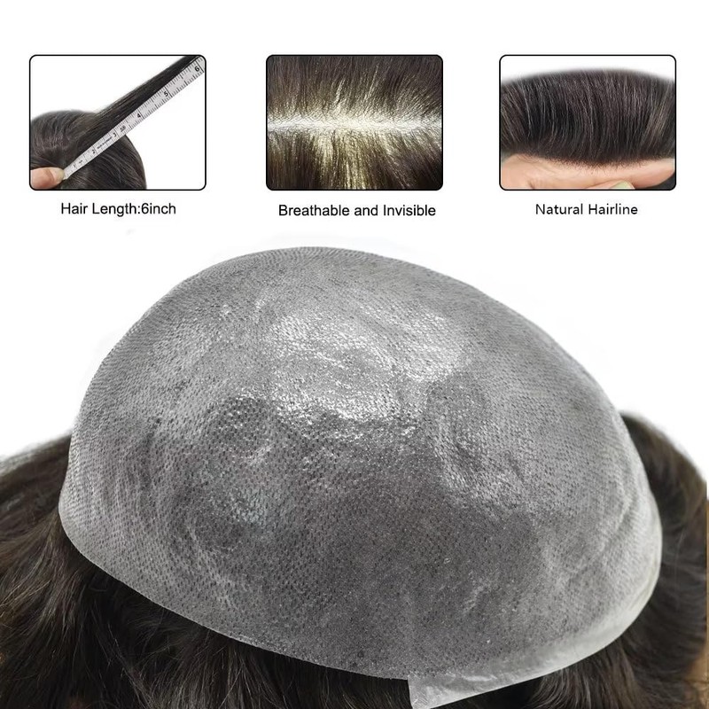 - 0.04mm ultra thin skin base toupee for men, V-loop all around, Natural Hairline, knotless, toupee appears as if hair grows out of your own scalp. transparent, light and comfortable mens toupee.