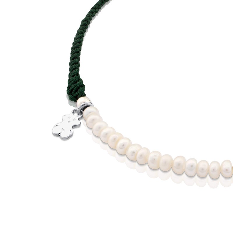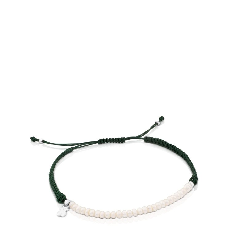 TOUS Women's Green Nylon Cultured Pearl Bracelet with Bear Motif in Sterling Silver, 0.2 cm, Combinable and Versatile, Color AG Collection