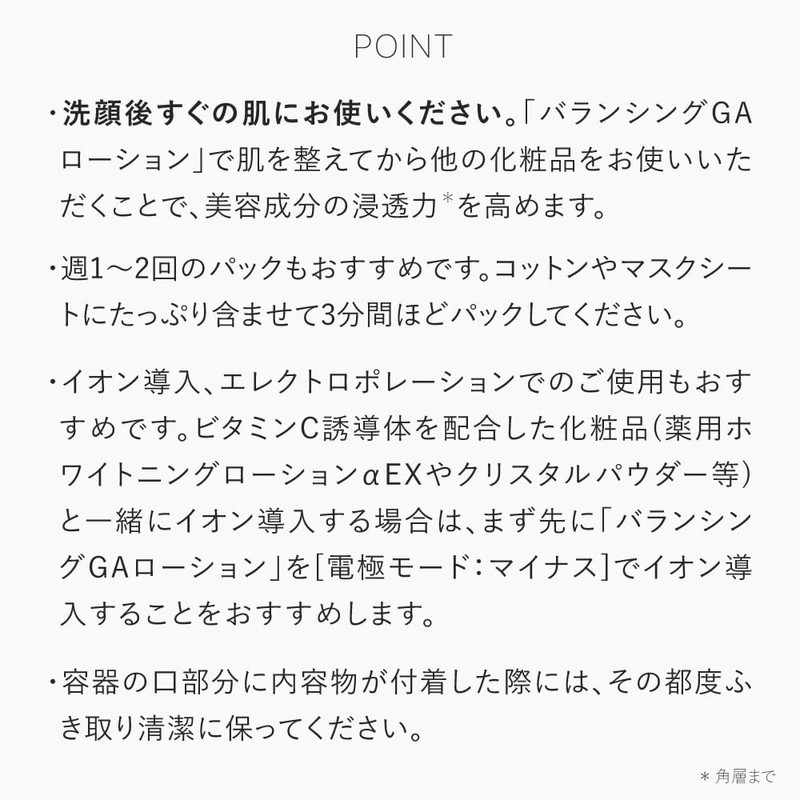 Use for skin immediately after washing your face.Use "Balancing GA Lotion" to trim your skin and then use other cosmetics to increase the penetration of your beauty ingredients.