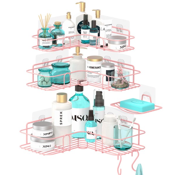 - Different Sizes - You will get 3 different size pink corner shower caddies (Large: 10.63 × 10.63 × 2.56 inches, Medium: 9.84 × 9.84 × 2.16 inches, Small: 9.44 × 9.44 × 1.96inches), 1 soap dish holder (5.11 × 3.54 × 1.57 inches) and 2 S hooks (3.15 × 1.18 inches),8 x large adhesives,1 x small adhesives in one package. No drilling required, easy installation.The stickiness of adhesive is strong, you don’t need to worry about the bath basket moving easily.