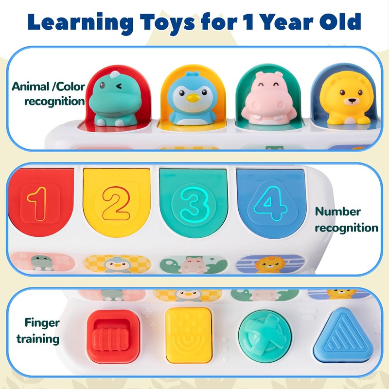 • Cause and Effect Toy for Toddlers: Baby learning toy 12-18 months with 4 buttons of different colors, numbers, shapes and buttons, when activating the button, guess which animal pops out?