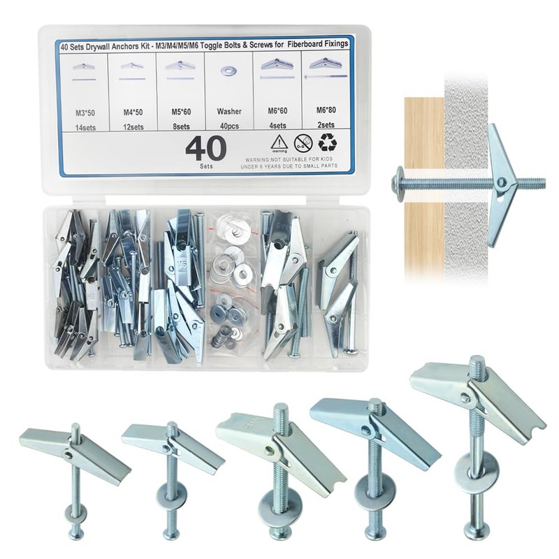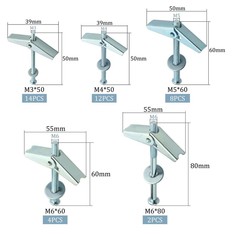 • 【40PCS Set】: The kit contains 40pcs carbon steel fixings for hollow wall: M3*50mm(14sets), M4*50mm(12sets), M5*60mm(8sets), M6*60mm(4sets), M6*80mm(2sets), washers: 40pcs.
