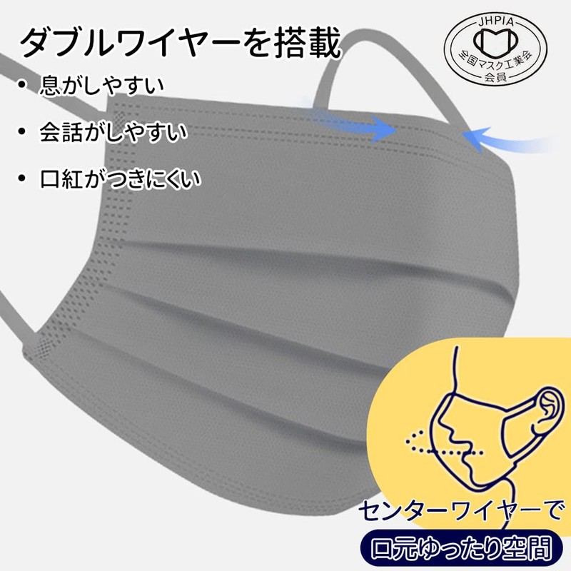- 『フィット感抜群のダブルワイヤーカラ―マスク』このダブルワイヤーカラーマスクは着け心地の良い素材と構造の物を採用しています。ノーズワイヤーにより鼻のカーブにぴったりフィットします。センターワイヤーがある事で口元に空間が出来て呼吸がし易く、メガネが曇りづらく、会話がしやすいのも特徴の一つです。女性にとってうれしいのは口紅やお化粧が着きにくい構造になっている事です。更に立体プリーツ加工を採用しているので口周り全体に立体的な空間を確保できます。シリコン製の耳保護をおまけます。