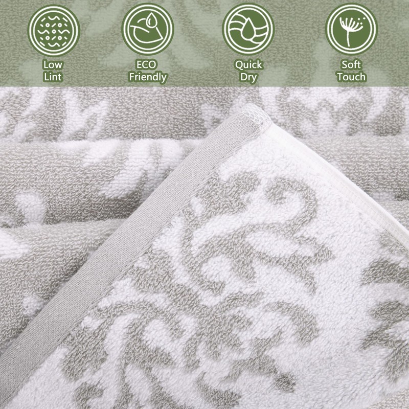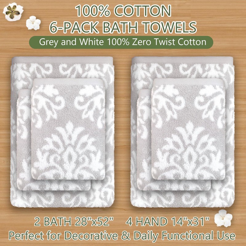 Towels for Bathroom - Cotton | Soft | Quick Dry | Lightweight | Absorb, 6 Piece Towel Set, 2 Bath 24"x42", 4 Hand 14"x31", Gray Decorative Bathroom Towels Set, Dorm Shower Towel Set, Grey/White Damask