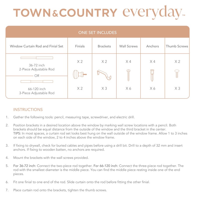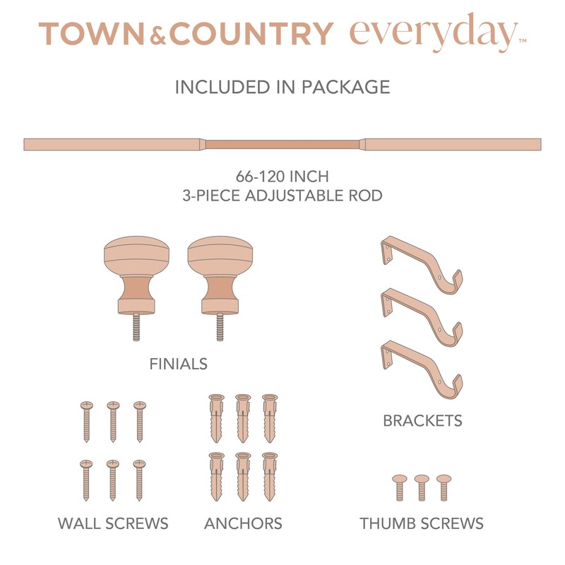 - Includes one (1) adjustable rod in three pieces, two (2) finials, three (3) 3.5" depth brackets for mounting on walls, and installation hardware with instructions