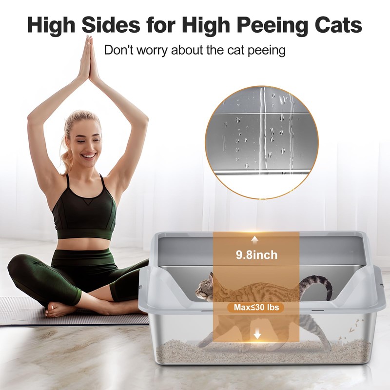 - 【High-Sided Design】The high-sided design (9.84"H) of this stainless steel litter box effectively prevents litter from spilling and leaking, keeping your floors clean. The large size of 23.62"L x 15.74"W is perfect for cats who like to dig or need more space to move around. This steel litter box is especially beneficial for active cats.