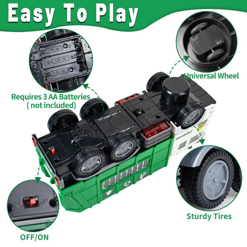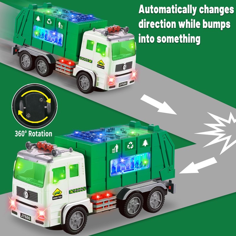 - Great Garbage Truck Toy for Kids: This Garbage truck Toy is built with bump and go action, driving along on its own as if a human is driving it. Children will be delighted as the truck moves forward, backward and spins 360 degree! And when the garbage toy bumps into something, it will automatically turn away and drive in another direction, it rides smoothly on the floor.