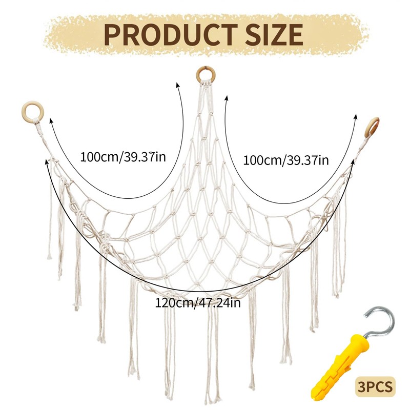 2.Die gefüllte Spielzeughängematte besteht aus hochwertigem Baumwollseil, verformt oder reißt nicht so leicht, ist robust und sicher.