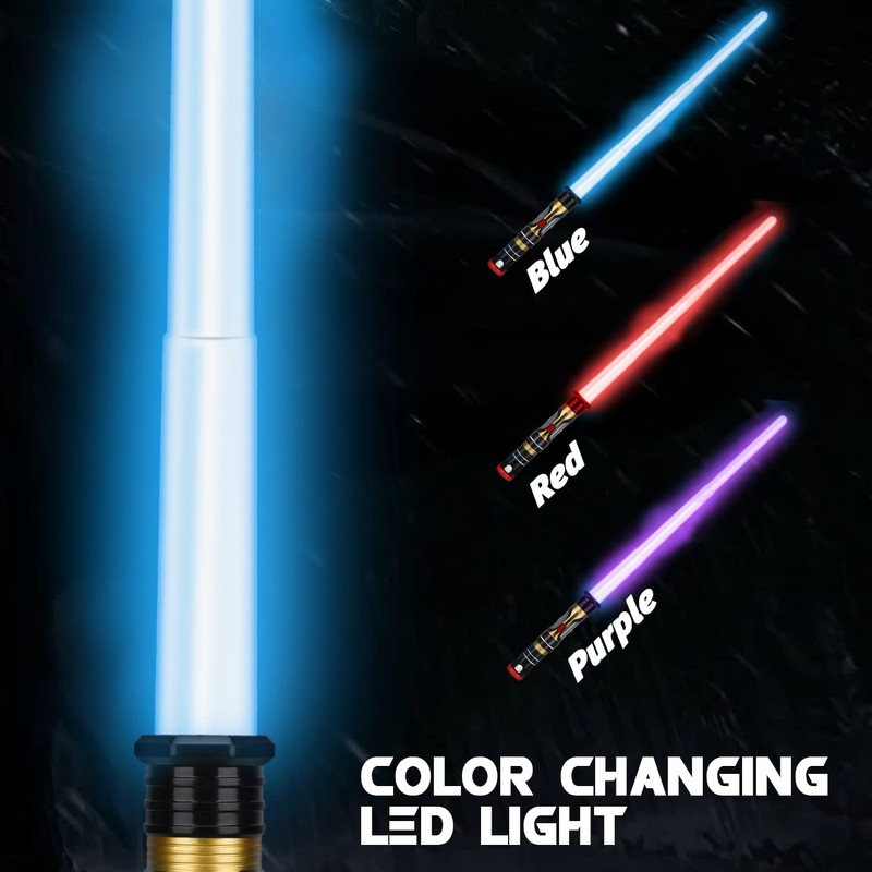 - - 3 COLORED LIGHTS: Both of these sabers have three light modes - red, blue, and purple. Choose your favorite color to pick your skill level and to show off what side you’ve picked in this interstellar battle.