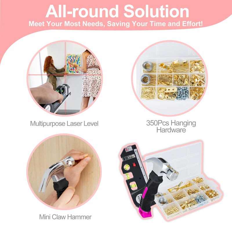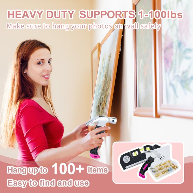 TOYIEW Picture Hanging Kit Tool, 352pcs Hanging Hardware with Heavy Duty Frame Hooks, Wire, Nails, D Rings, Photo Sawtooth Hangers, Wall Art Hanging Kit with Laser Level, Pink Claw Hammer
