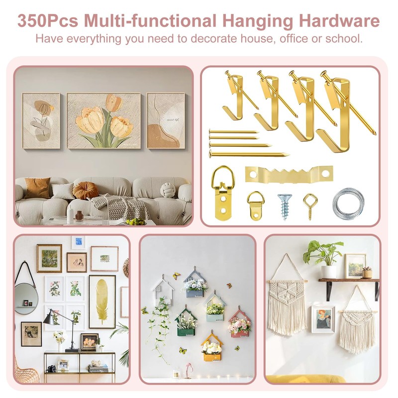- Comprehensive Mounting Solution: Unlock Endless Decorating Possibilities with TOYIEW Picture Hanging Kit. Equipped with a versatile 350 Hanging Hardware including picture hangers, nails for hanging pictures, picture hooks, sawtooth picture hangers, picture wire, screw eye, d rings and Double Holes D Ring. You'll have everything you need to securely mount paintings, mirrors, wall art, and more on drywall or plaster with ease. From lightweight frames to hefty canvas, this kit has you covered